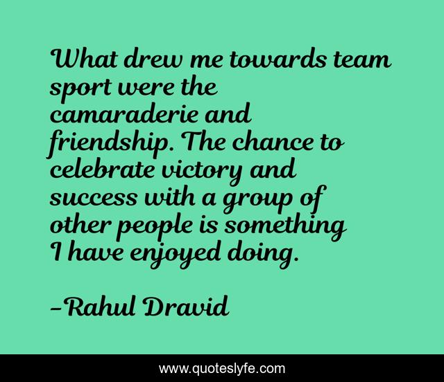 This page presents the quote "What drew me towards team sport were the camaraderie and friendship. The chance to celebrate victory and success with a group of other people is something I have enjoyed doing.". Author of this quote is Rahul Dravid. This quote is about friendship, success, team,.