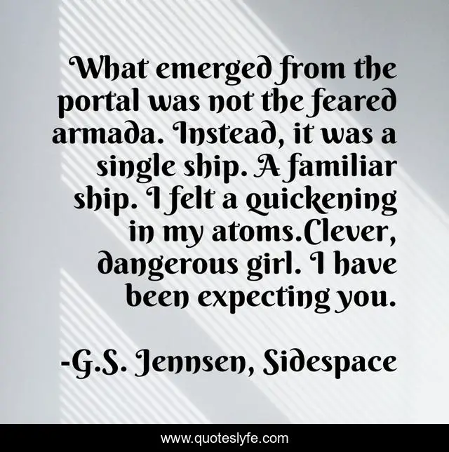 This page presents the quote "What emerged from the portal was not the feared armada. Instead, it was a single ship. A familiar ship. I felt a quickening in my atoms.Clever, dangerous girl. I have been expecting you.". Author of this quote is G.S. Jennsen, Sidespace. This quote is about spaceships, science-fiction, space-opera, scifi, space-exploration, adventure,.