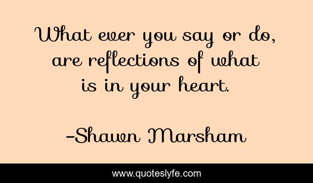This page presents the quote "What ever you say or do, are reflections of what is in your heart.". Author of this quote is Shawn Marsham. This quote is about enthusiasm, life, inspirational, life-lessons,.