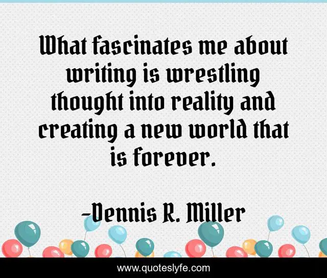 This page presents the quote "What fascinates me about writing is wrestling thought into reality and creating a new world that is forever.". Author of this quote is Dennis R. Miller. This quote is about forever, reality, new-world, writing,.