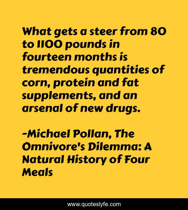 "Michael Pollan, The Omnivore's Dilemma: A Natural History of Four Meals Quotes." Quoteslyfe.com, 2025. Fri. 05 Dec. 2025. <https://www.quoteslyfe.com/quote/What-gets-a-steer-from-80-to-168105>.