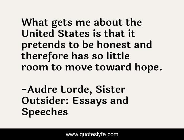 This page presents the quote "What gets me about the United States is that it pretends to be honest and therefore has so little room to move toward hope.". Author of this quote is Audre Lorde, Sister Outsider: Essays and Speeches. This quote is about honesty, hope, american-culture,.