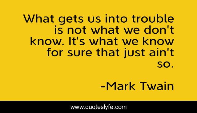 This page presents the quote "What gets us into trouble is not what we don't know. It's what we know for sure that just ain't so.". Author of this quote is Mark Twain. .
