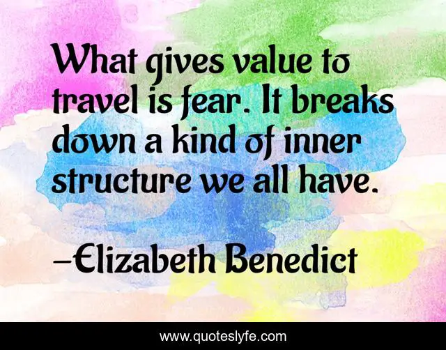 This page presents the quote "What gives value to travel is fear. It breaks down a kind of inner structure we all have.". Author of this quote is Elizabeth Benedict. This quote is about fear, travel,.