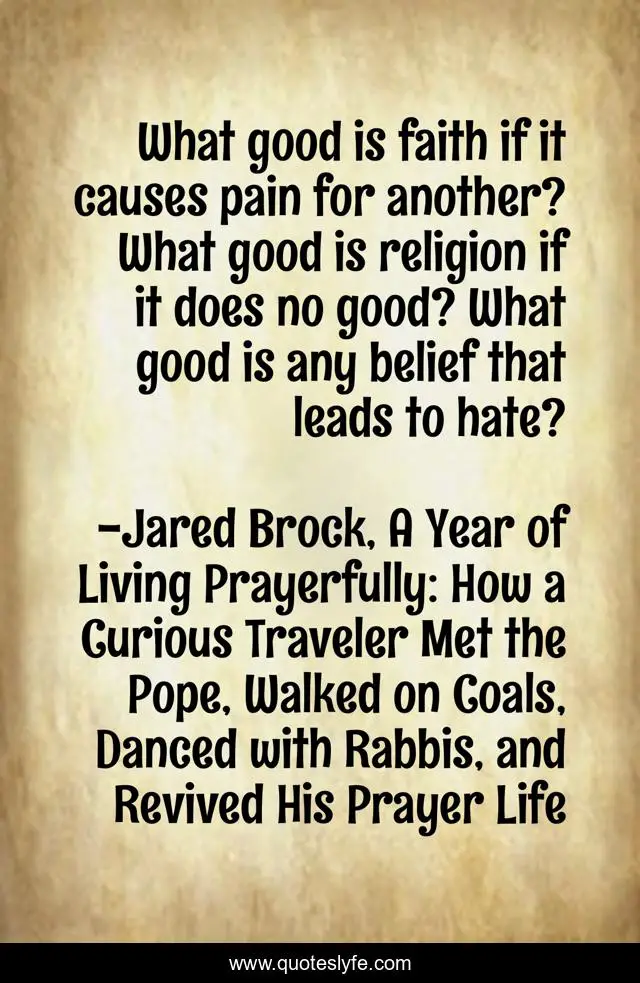 "Jared Brock, A Year of Living Prayerfully: How a Curious Traveler Met the Pope, Walked on Coals, Danced with Rabbis, and Revived His Prayer Life Quotes." Quoteslyfe.com, 2025. Sat. 06 Dec. 2025. <https://www.quoteslyfe.com/quote/What-good-is-faith-if-it-causes-111383>.