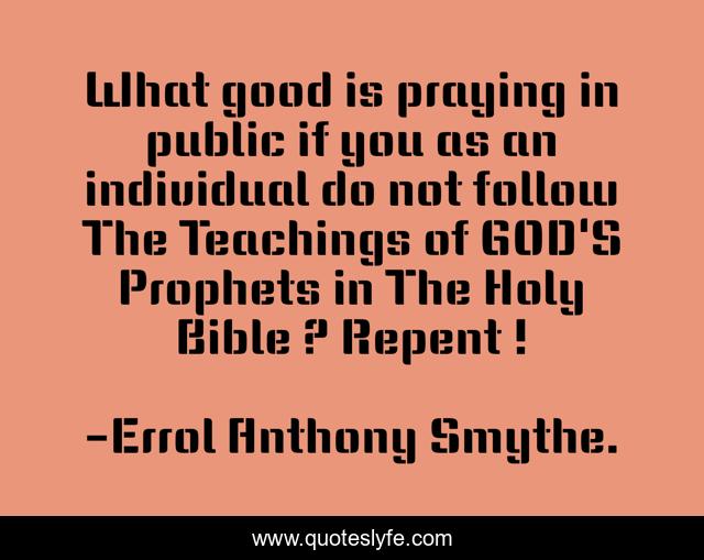 This page presents the quote "What good is praying in public if you as an individual do not follow The Teachings of GOD'S Prophets in The Holy Bible ? Repent !". Author of this quote is Errol Anthony Smythe.. This quote is about scoffers, redemption, spineless, god, godless, repentance, mockers, repent, nation,.