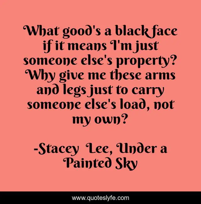This page presents the quote "What good's a black face if it means I'm just someone else's property? Why give me these arms and legs just to carry someone else's load, not my own?". Author of this quote is Stacey Lee, Under a Painted Sky. This quote is about black-identity, stacey-lee, freedom, under-a-painted-sky, slavery, race-relations, carrying-on, blackness, annamae,.