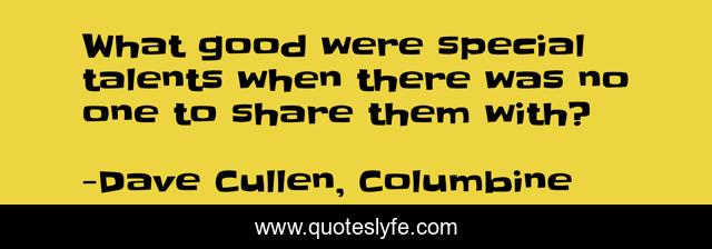 This page presents the quote "What good were special talents when there was no one to share them with?". Author of this quote is Dave Cullen, Columbine. This quote is about special-talents, sharing, loneliness, talents, lonely-people, shared-memories,.