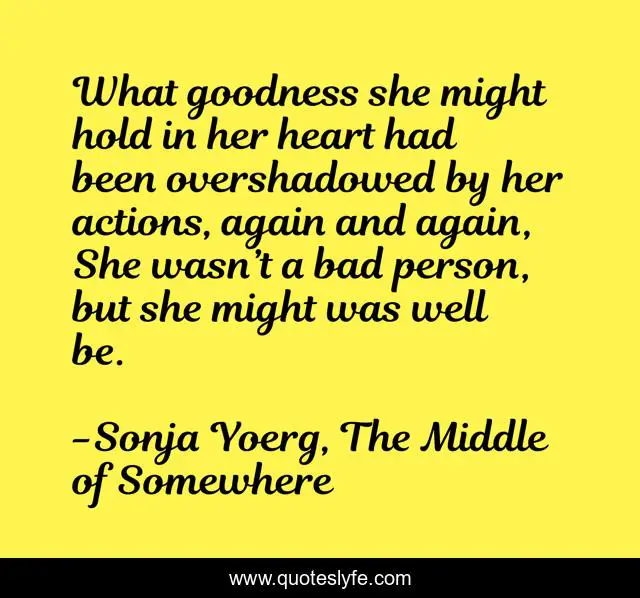 This page presents the quote "What goodness she might hold in her heart had been overshadowed by her actions, again and again, She wasn’t a bad person, but she might was well be.". Author of this quote is Sonja Yoerg, The Middle of Somewhere. This quote is about morality, sin, regret,.
