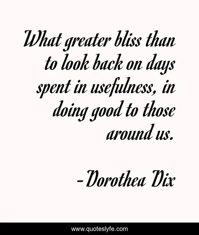 This page presents the quote "What greater bliss than to look back on days spent in usefulness, in doing good to those around us.". Author of this quote is Dorothea Dix. This quote is about doing good, look,.