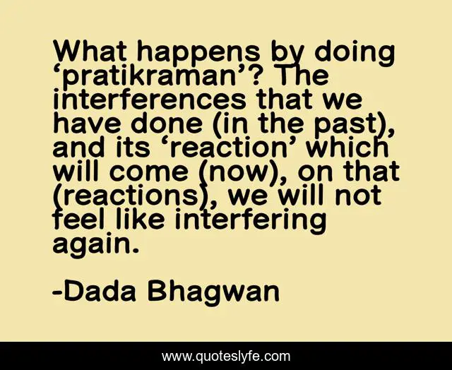 This page presents the quote "What happens by doing ‘pratikraman’? The interferences that we have done (in the past), and its ‘reaction’ which will come (now), on that (reactions), we will not feel like interfering again.". Author of this quote is Dada Bhagwan. This quote is about feel, pratikraman, spiritual, interference, reaction,.