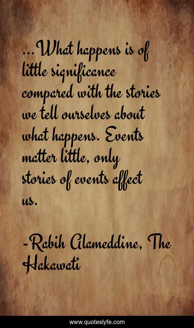 This page presents the quote "...What happens is of little significance compared with the stories we tell ourselves about what happens. Events matter little, only stories of events affect us.". Author of this quote is Rabih Alameddine, The Hakawati. This quote is about story, perception, stories, storytelling, reality,.