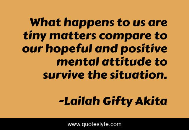This page presents the quote "What happens to us are tiny matters compare to our hopeful and positive mental attitude to survive the situation.". Author of this quote is Lailah Gifty Akita. This quote is about difficulties-of-life, hope, positive-thinking,.