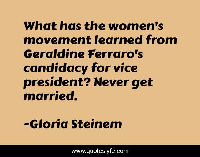 This page presents the quote "What has the women's movement learned from Geraldine Ferraro's candidacy for vice president? Never get married.". Author of this quote is Gloria Steinem. This quote is about president, movement,.