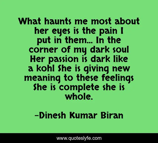 This page presents the quote "What haunts me most about her eyes is the pain I put in them... In the corner of my dark soul Her passion is dark like a kohl She is giving new meaning to these feelings She is complete she is whole.". Author of this quote is Dinesh Kumar Biran. This quote is about lovers, love, poetry, affection, poetry-love,.