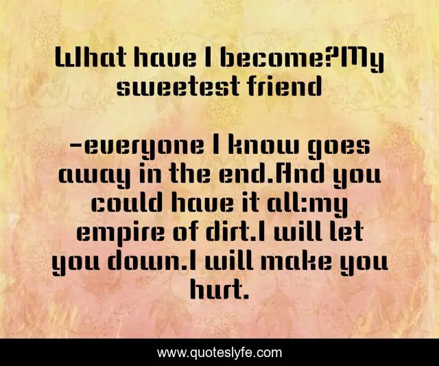 "everyone I know goes away in the end.And you could have it all:my empire of dirt.I will let you down.I will make you hurt. Quotes." Quoteslyfe.com, 2025. Fri. 05 Dec. 2025. <https://www.quoteslyfe.com/quote/What-have-I-become-My-sweetest-friend-138750>.