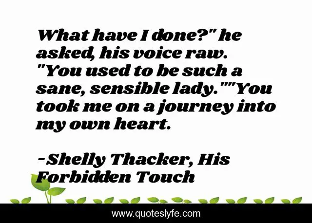 This page presents the quote "What have I done?" he asked, his voice raw. "You used to be such a sane, sensible lady.""You took me on a journey into my own heart.". Author of this quote is Shelly Thacker, His Forbidden Touch. This quote is about romance, historical-romance,.