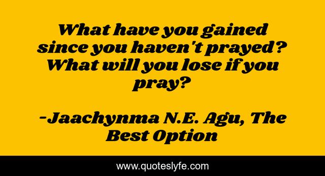 This page presents the quote "What have you gained since you haven't prayed? What will you lose if you pray?". Author of this quote is Jaachynma N.E. Agu, The Best Option. This quote is about motivation, inspiration, higher-living, success, prayer,.