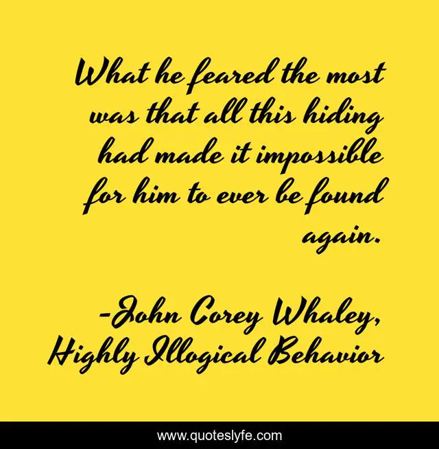 This page presents the quote "What he feared the most was that all this hiding had made it impossible for him to ever be found again.". Author of this quote is John Corey Whaley, Highly Illogical Behavior. This quote is about shyness, fear, agoraphobia, hiding,.