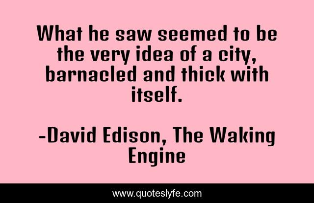 This page presents the quote "What he saw seemed to be the very idea of a city, barnacled and thick with itself.". Author of this quote is David Edison, The Waking Engine. .