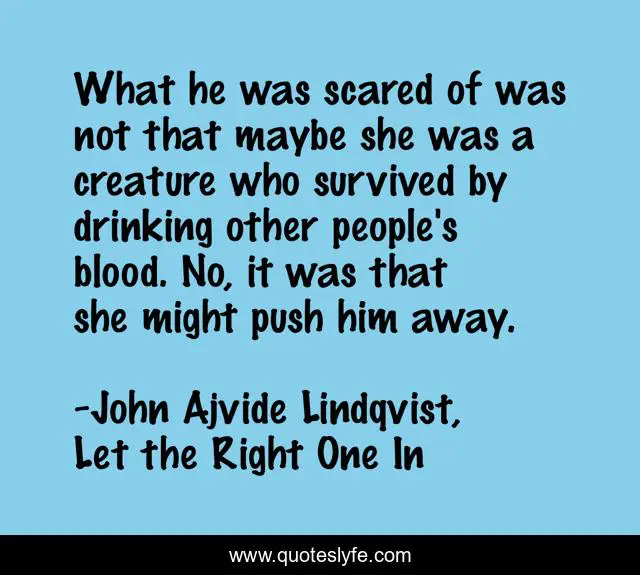 This page presents the quote "What he was scared of was not that maybe she was a creature who survived by drinking other people's blood. No, it was that she might push him away.". Author of this quote is John Ajvide Lindqvist, Let the Right One In. This quote is about fear, intimacy,.