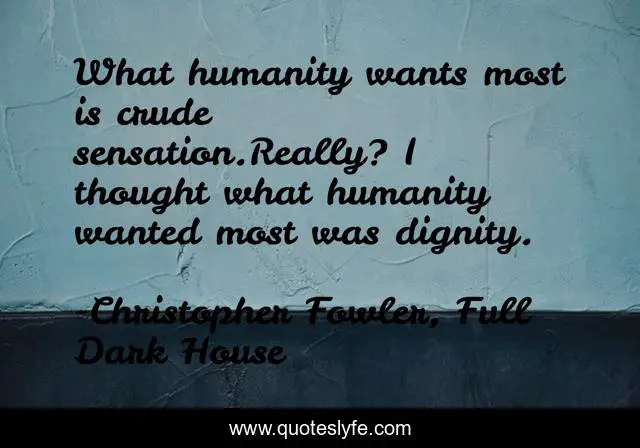 This page presents the quote "What humanity wants most is crude sensation.Really? I thought what humanity wanted most was dignity.". Author of this quote is Christopher Fowler, Full Dark House. This quote is about dignity, humanity,.