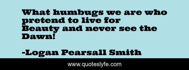 This page presents the quote "What humbugs we are who pretend to live for Beauty and never see the Dawn!". Author of this quote is Logan Pearsall Smith. .