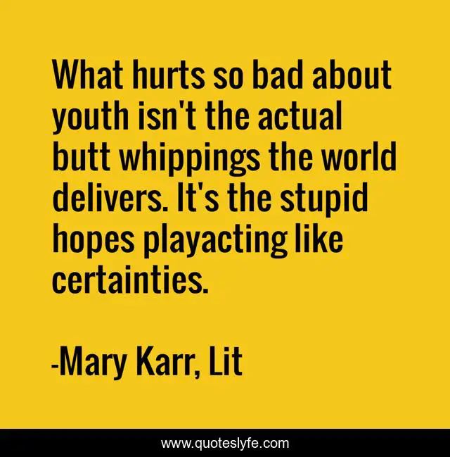 This page presents the quote "What hurts so bad about youth isn't the actual butt whippings the world delivers. It's the stupid hopes playacting like certainties.". Author of this quote is Mary Karr, Lit. This quote is about youth, disappointment, hope,.