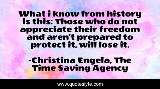 This page presents the quote "What i know from history is this: Those who do not appreciate their freedom and aren't prepared to protect it, will lose it.". Author of this quote is Christina Engela, The Time Saving Agency. This quote is about freedom, protect, history, appreciate, lose,.