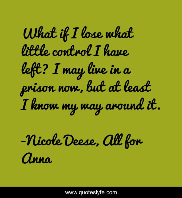 This page presents the quote "What if I lose what little control I have left? I may live in a prison now, but at least I know my way around it.". Author of this quote is Nicole Deese, All for Anna. This quote is about control, ptsd, prison,.