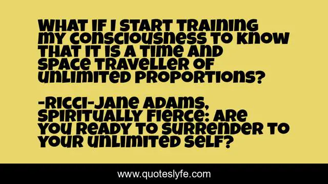 This page presents the quote "What if I start training my consciousness to know that it is a time and space traveller of unlimited proportions?". Author of this quote is Ricci-Jane Adams, Spiritually Fierce: Are you ready to surrender to your unlimited self?. This quote is about personal-development, inspiration, self-help,.