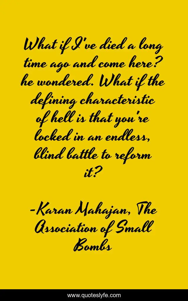 This page presents the quote "What if I've died a long time ago and come here? he wondered. What if the defining characteristic of hell is that you're locked in an endless, blind battle to reform it?". Author of this quote is Karan Mahajan, The Association of Small Bombs. This quote is about hell, terrorism, political, politics,.