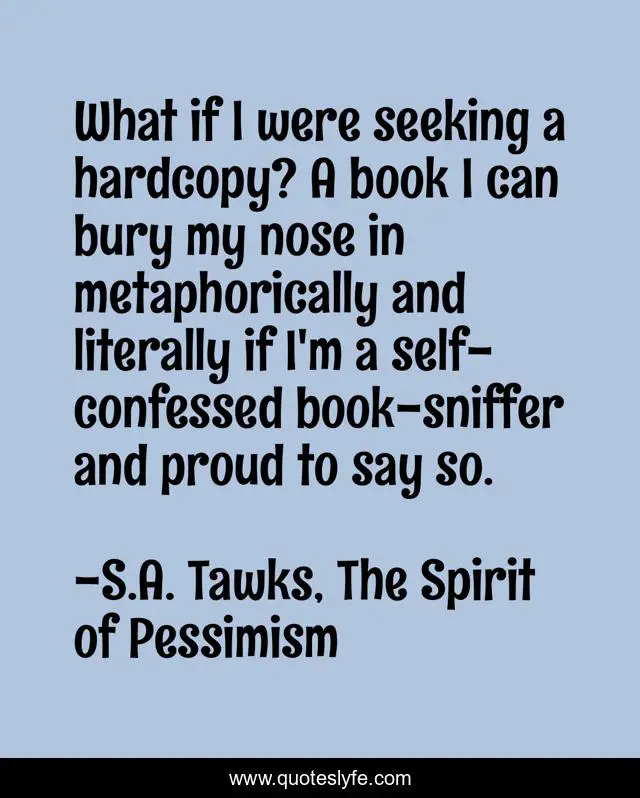 This page presents the quote "What if I were seeking a hardcopy? A book I can bury my nose in metaphorically and literally if I'm a self-confessed book-sniffer and proud to say so.". Author of this quote is S.A. Tawks, The Spirit of Pessimism. This quote is about spirituality, author, writing, imagination, reader, reading,.