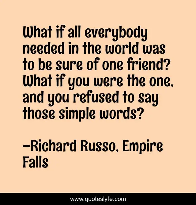 This page presents the quote "What if all everybody needed in the world was to be sure of one friend? What if you were the one, and you refused to say those simple words?". Author of this quote is Richard Russo, Empire Falls. This quote is about friends, friendship,.