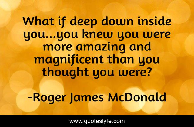 This page presents the quote "What if deep down inside you...you knew you were more amazing and magnificent than you thought you were?". Author of this quote is Roger James McDonald. This quote is about knowing, introspection, power, thinking, magnificent, thought, amazing, prayer, meditation,.