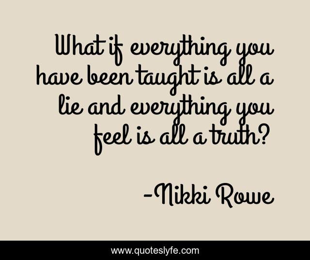 This page presents the quote "What if everything you have been taught is all a lie and everything you feel is all a truth?". Author of this quote is Nikki Rowe. This quote is about spiritual-growth, spiritual, nikki-rowe, untameable, quote, truth, free-spirit, wild-child, quote-of-the-day,.