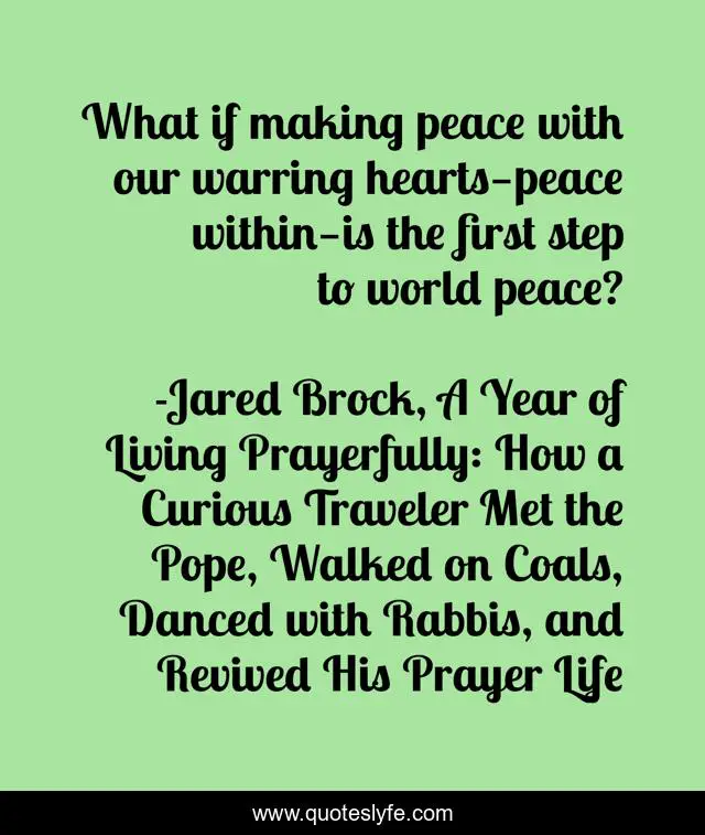 This page presents the quote "What if making peace with our warring hearts—peace within—is the first step to world peace?". Author of this quote is Jared Brock, A Year of Living Prayerfully: How a Curious Traveler Met the Pope, Walked on Coals, Danced with Rabbis, and Revived His Prayer Life. This quote is about world-peace, peace, serenity, inner-peace, war,.