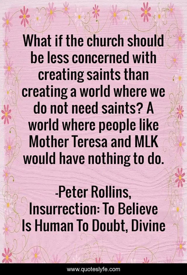 This page presents the quote "What if the church should be less concerned with creating saints than creating a world where we do not need saints? A world where people like Mother Teresa and MLK would have nothing to do.". Author of this quote is Peter Rollins, Insurrection: To Believe Is Human To Doubt, Divine. This quote is about saints, church,.