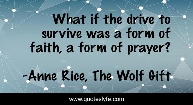 This page presents the quote "What if the drive to survive was a form of faith, a form of prayer?". Author of this quote is Anne Rice, The Wolf Gift. This quote is about faith, prayer, drive, survive,.