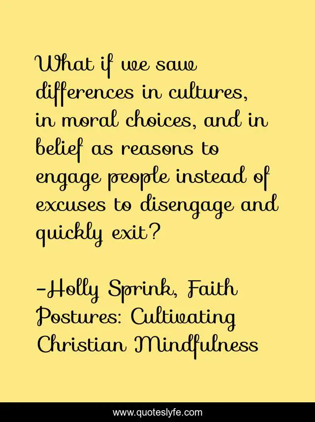 This page presents the quote "What if we saw differences in cultures, in moral choices, and in belief as reasons to engage people instead of excuses to disengage and quickly exit?". Author of this quote is Holly Sprink, Faith Postures: Cultivating Christian Mindfulness. This quote is about disengagement, culture, engagement, belief, moral-choices,.