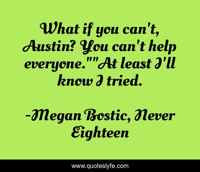 This page presents the quote "What if you can't, Austin? You can't help everyone.""At least I'll know I tried.". Author of this quote is Megan Bostic, Never Eighteen. This quote is about opportunity, regrets, siezing-the-time,.