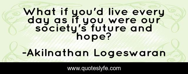This page presents the quote "What if you'd live every day as if you were our society's future and hope?". Author of this quote is Akilnathan Logeswaran. This quote is about live-your-life, society, future, inspirational, dedication, enthusiasm, tribute, hope,.
