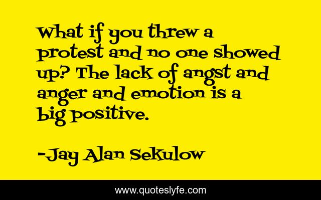 This page presents the quote "What if you threw a protest and no one showed up? The lack of angst and anger and emotion is a big positive.". Author of this quote is Jay Alan Sekulow. This quote is about emotion, positive, confidence,.