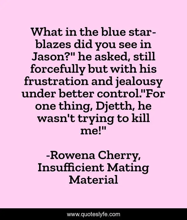This page presents the quote "What in the blue star-blazes did you see in Jason?" he asked, still forcefully but with his frustration and jealousy under better control."For one thing, Djetth, he wasn't trying to kill me!"". Author of this quote is Rowena Cherry, Insufficient Mating Material. This quote is about alien-romance, humor, humour, aliens, romance, fantasy, futuristic,.
