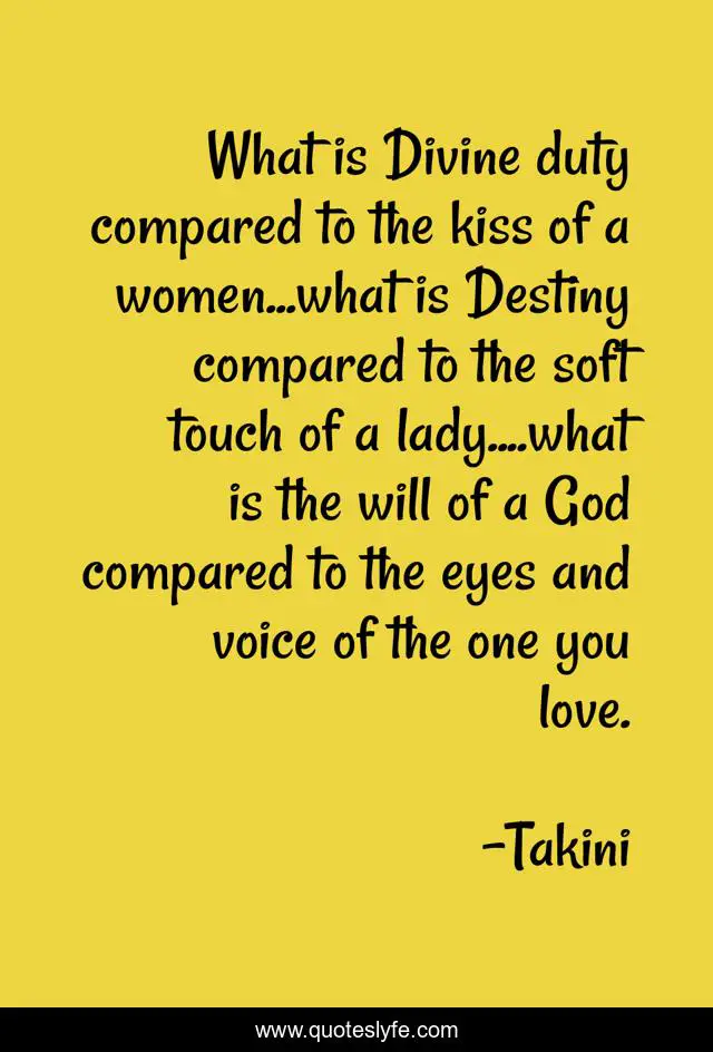 This page presents the quote "What is Divine duty compared to the kiss of a women...what is Destiny compared to the soft touch of a lady....what is the will of a God compared to the eyes and voice of the one you love.". Author of this quote is Takini. This quote is about god, destiny,.