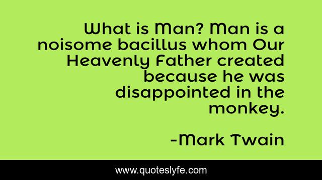 This page presents the quote "What is Man? Man is a noisome bacillus whom Our Heavenly Father created because he was disappointed in the monkey.". Author of this quote is Mark Twain. This quote is about evolution, creation, humor, mankind,.