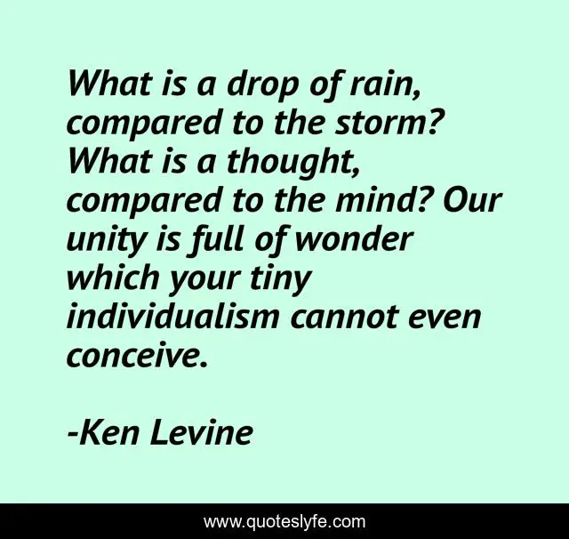 This page presents the quote "What is a drop of rain, compared to the storm? What is a thought, compared to the mind? Our unity is full of wonder which your tiny individualism cannot even conceive.". Author of this quote is Ken Levine. This quote is about unity, individualism,.