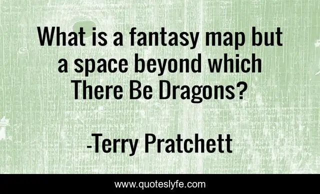 This page presents the quote "What is a fantasy map but a space beyond which There Be Dragons?". Author of this quote is Terry Pratchett. This quote is about fantasy, dragons, world, map,.