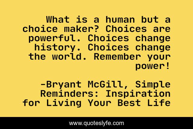 This page presents the quote "What is a human but a choice maker? Choices are powerful. Choices change history. Choices change the world. Remember your power!". Author of this quote is Bryant McGill, Simple Reminders: Inspiration for Living Your Best Life. This quote is about choices, power, history,.