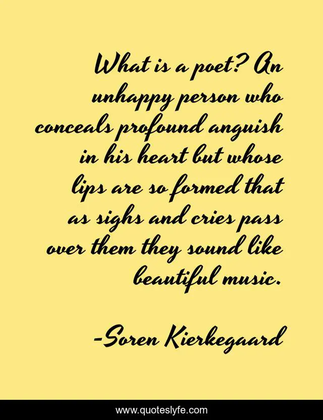 This page presents the quote "What is a poet? An unhappy person who conceals profound anguish in his heart but whose lips are so formed that as sighs and cries pass over them they sound like beautiful music.". Author of this quote is Soren Kierkegaard. This quote is about beautiful, heart, poetry,.